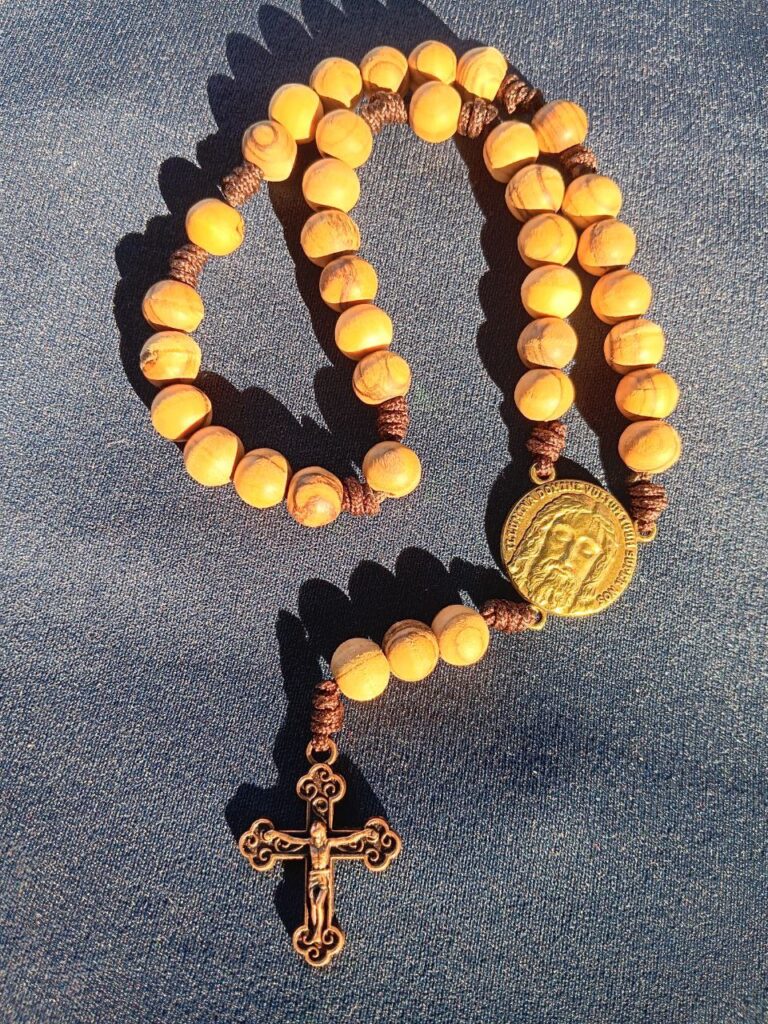 Las medallas centrales son el Rostro de Cristo del Santo Sudario de Turín y están inscritas con oraciones en el frente y el reverso.