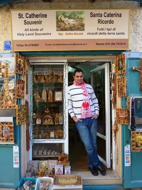 Saliba Bandak es uno de los pocos cristianos que quedan en Belén, y depende de la venta de recuerdos a los turistas. Sus artículos pueden adquirirse en: www.genesiscatholic.com.
