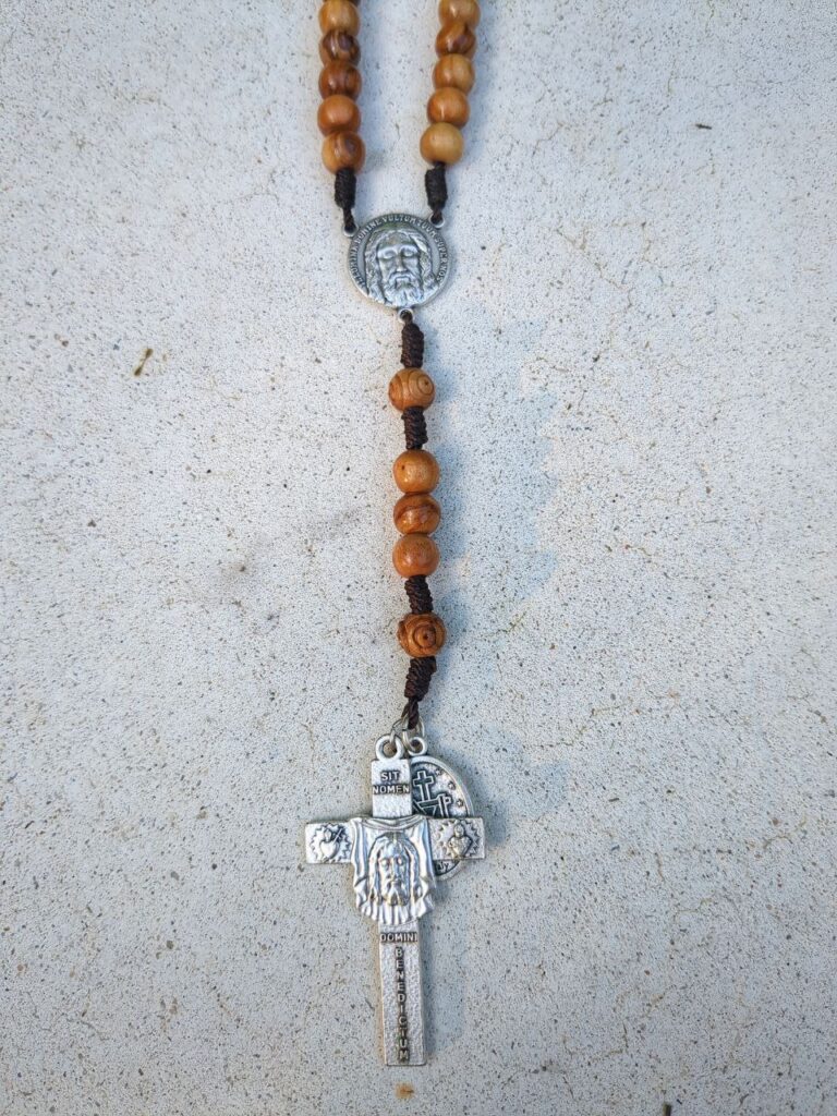 The center Medals are the Face of Christ from the Shroud of Turin and inscribed with prayers on the front and back.